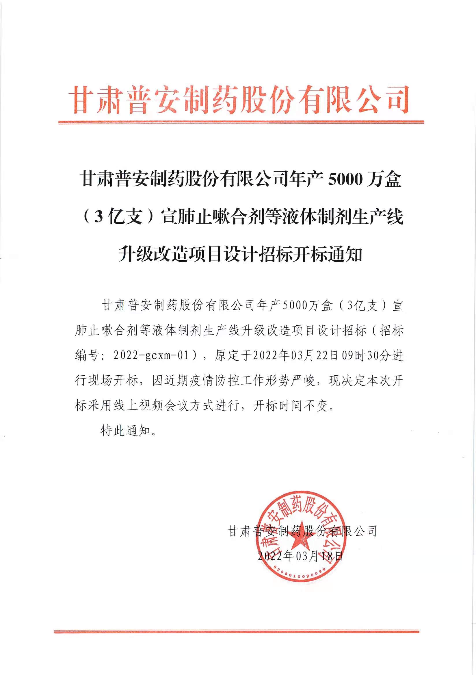 甘肅普安制藥股份有限公司年產(chǎn)5000萬盒(3億支)宣肺止嗽合劑等液體制劑生產(chǎn)線升級(jí)改造項(xiàng)目設(shè)計(jì)招標(biāo)開標(biāo)通知