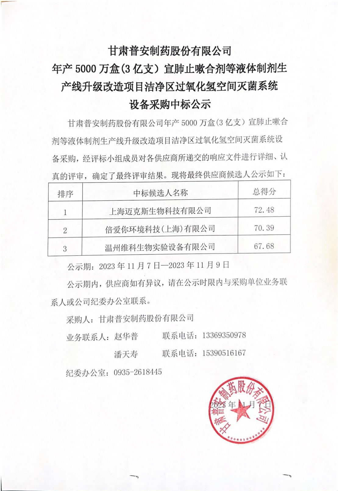 甘肅普安制藥股份有限公司年產(chǎn)5000萬(wàn)盒(3億支)宣肺止嗽合劑等液體制劑生產(chǎn)線升級(jí)改造項(xiàng)目潔凈區(qū)過(guò)氧化氫空間滅菌系統(tǒng)設(shè)備采購(gòu)中標(biāo)公示