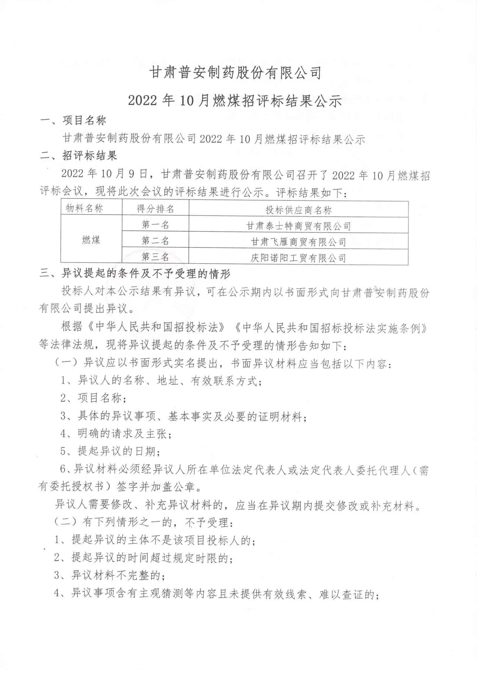 甘肅普安制藥股份有限公司2022年10月燃煤招評標結果的公示