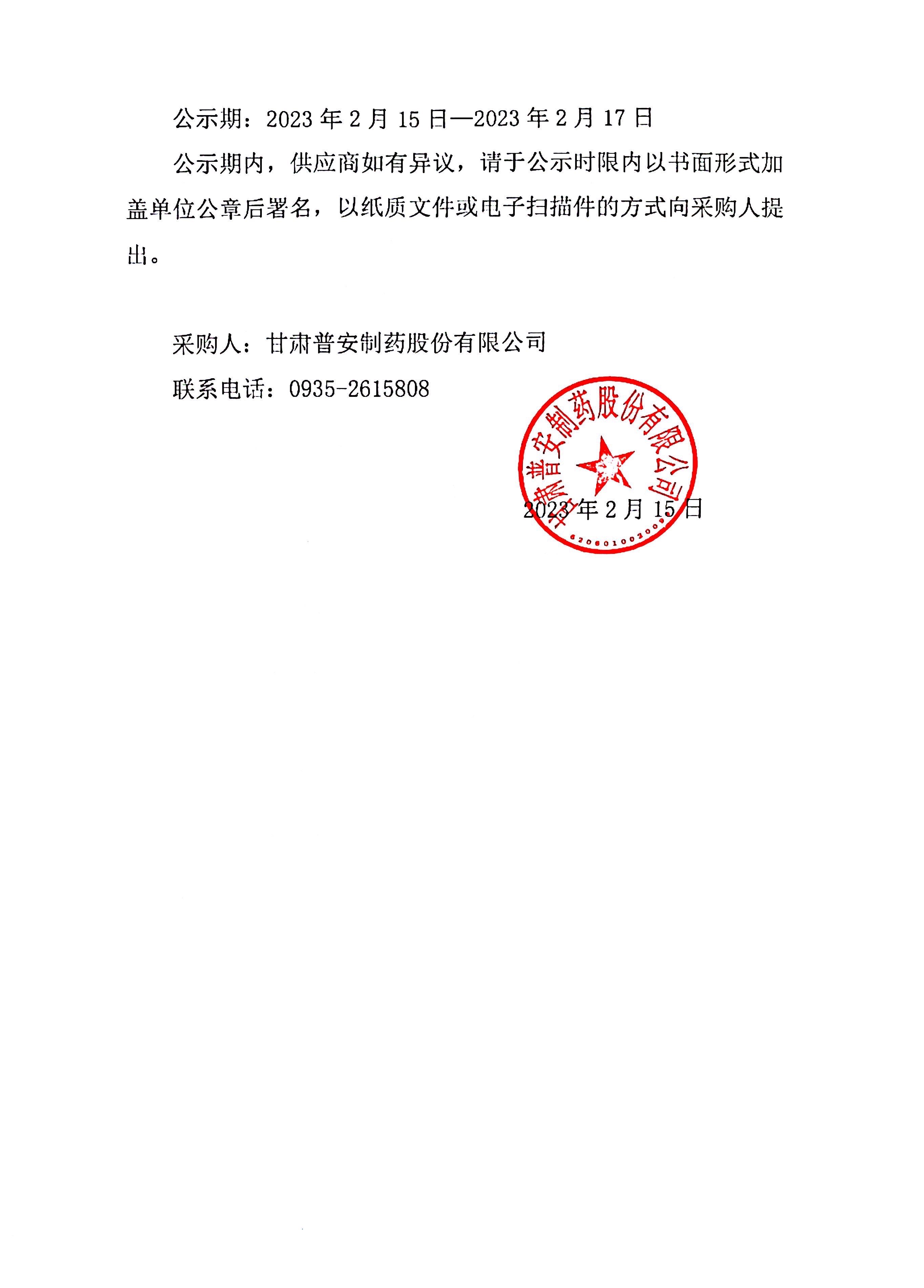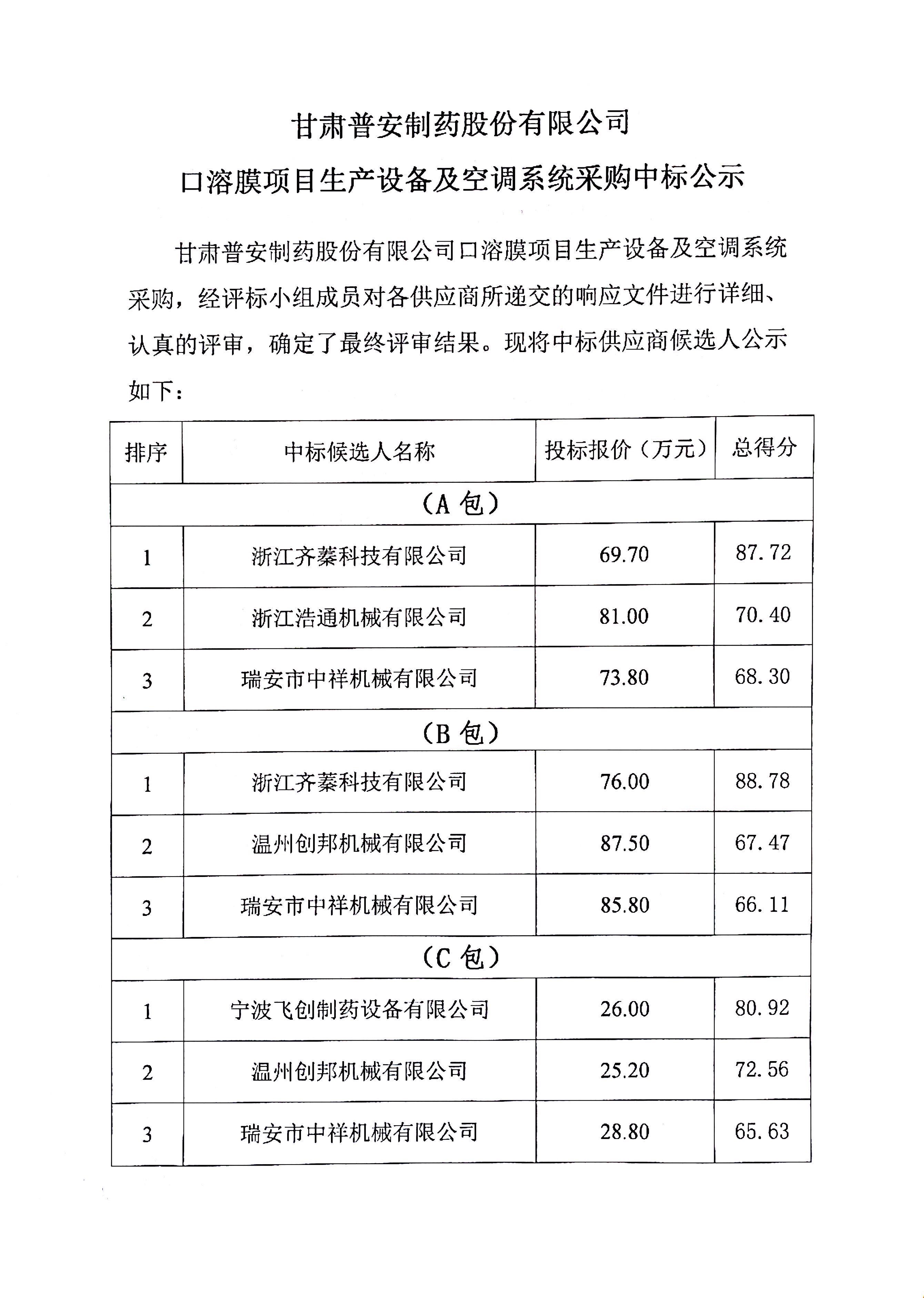 甘肅普安制藥股份有限公司口溶膜項目生產設備及空調系統采購中標公示