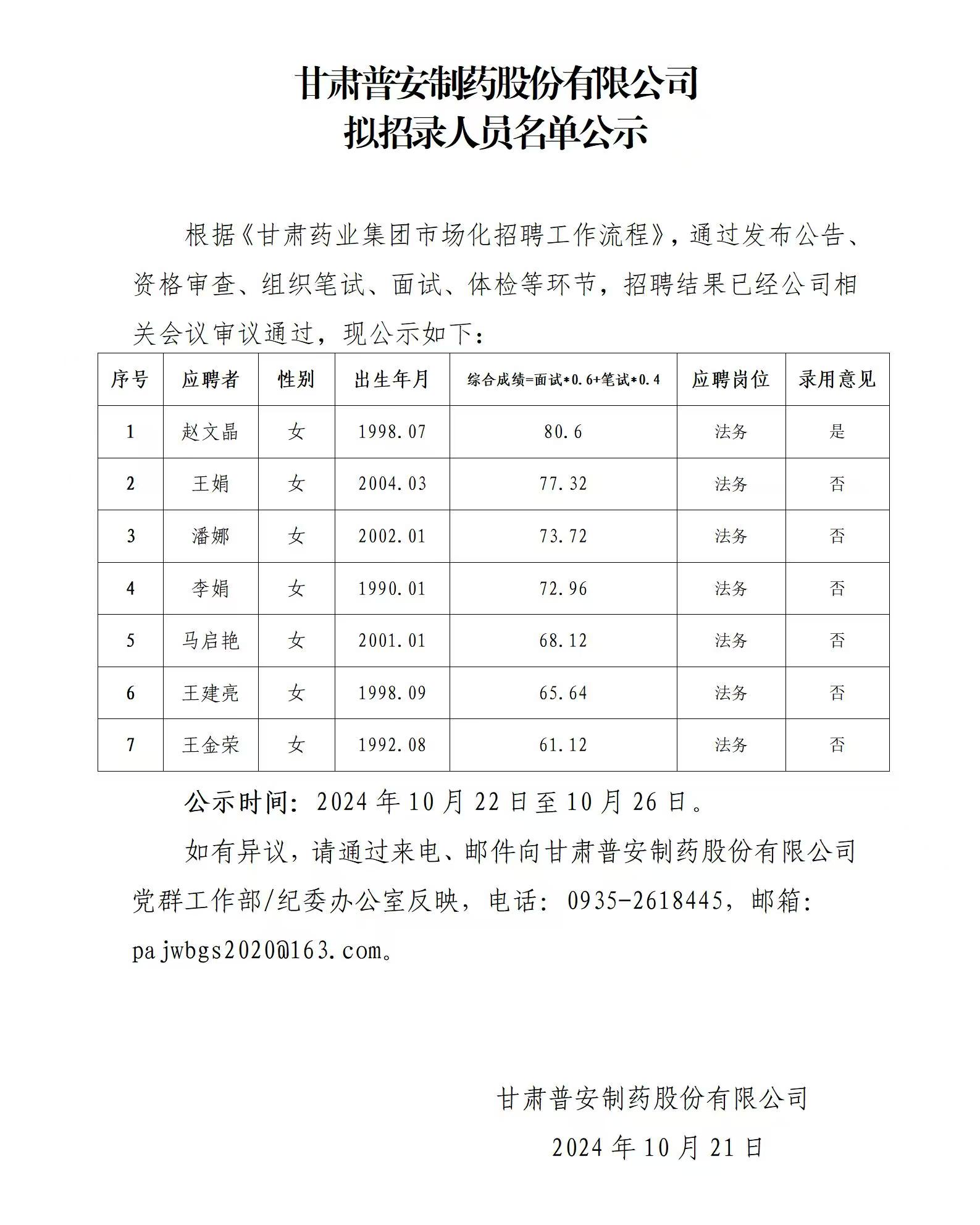 甘肅普安制藥股份有限公司擬招錄人員名單公示