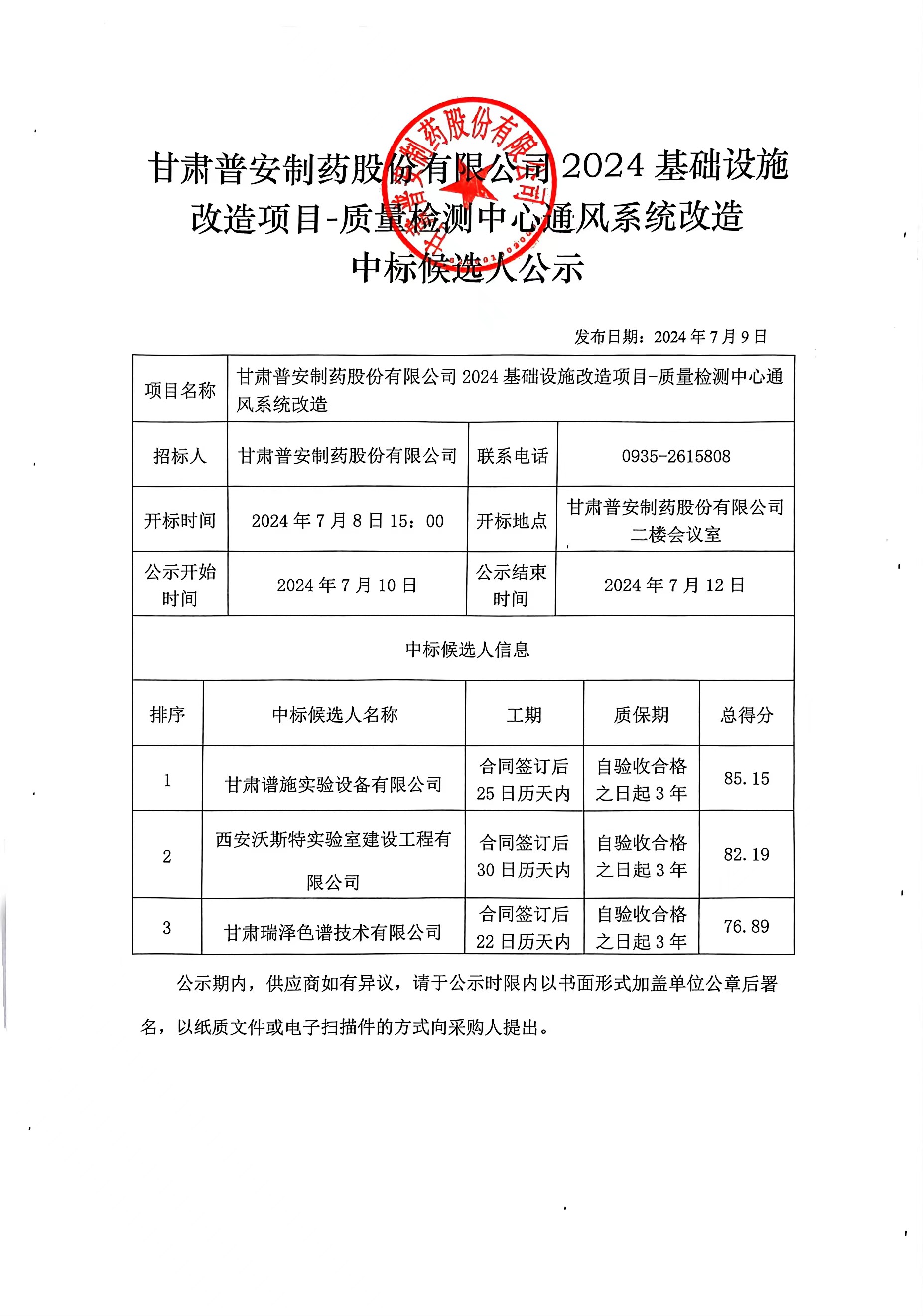 甘肅普安制藥股份有限公司2024年基礎設施改造項目-質量檢測中心通風系統改造中標候選人公示