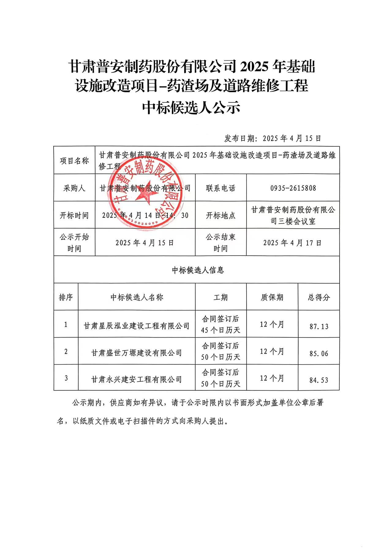甘肅普安制藥股份有限公司2025年基礎設施改造項目-藥渣場及道路維修工程中標候選人公示