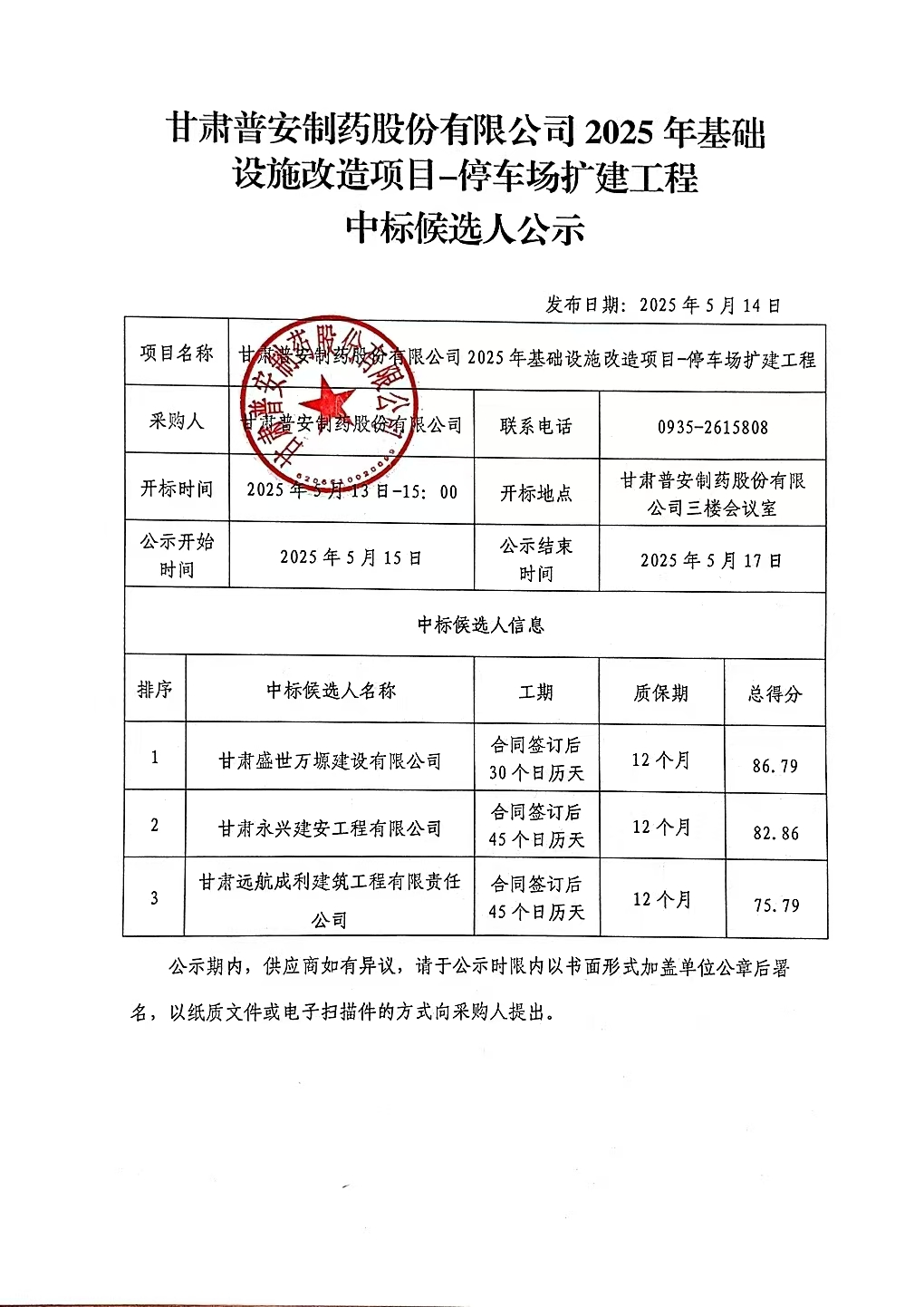 甘肅普安制藥股份有限公司2025年基礎設施改造項目——停車場擴建工程中標候選人公示