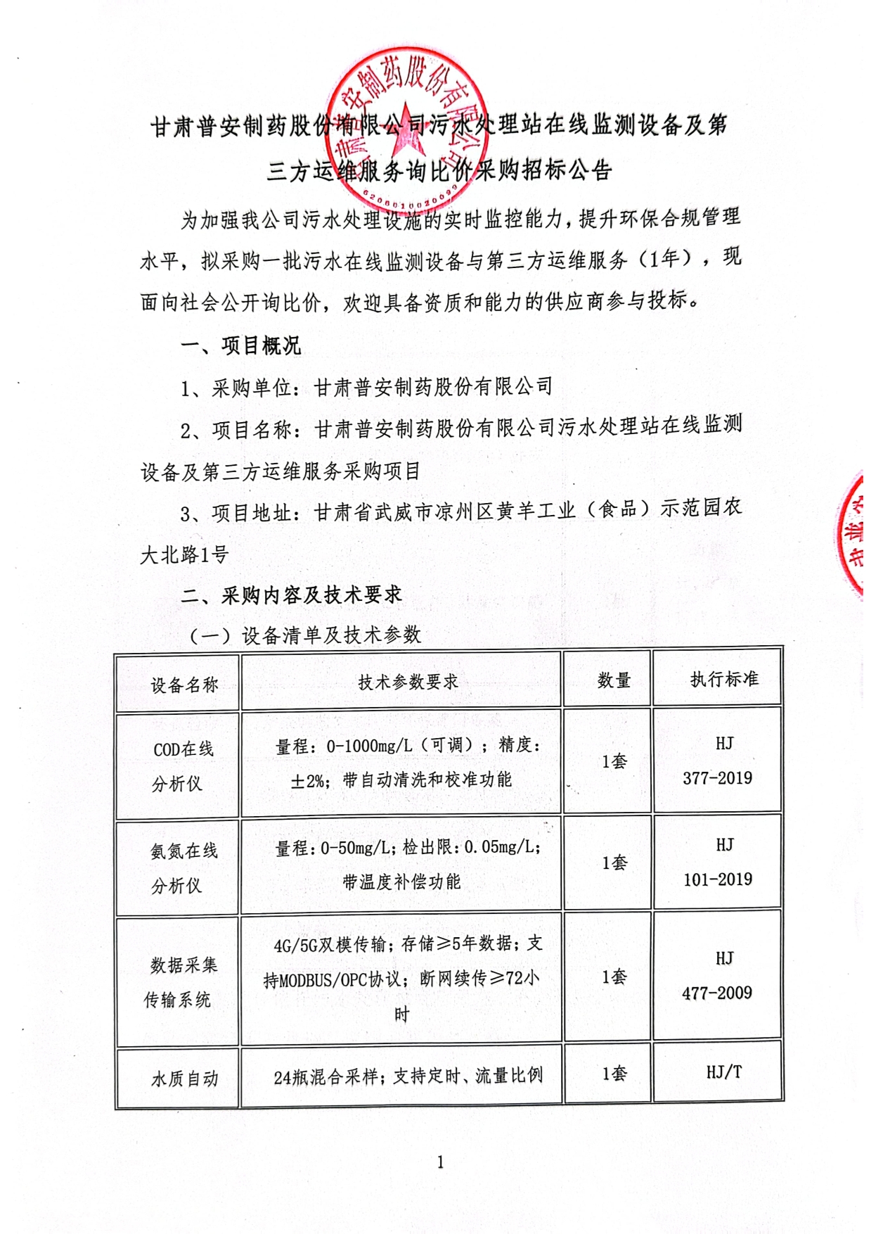 甘肅普安制藥股份有限公司污水處理站在線監測設備及第三方運維服務采購項目