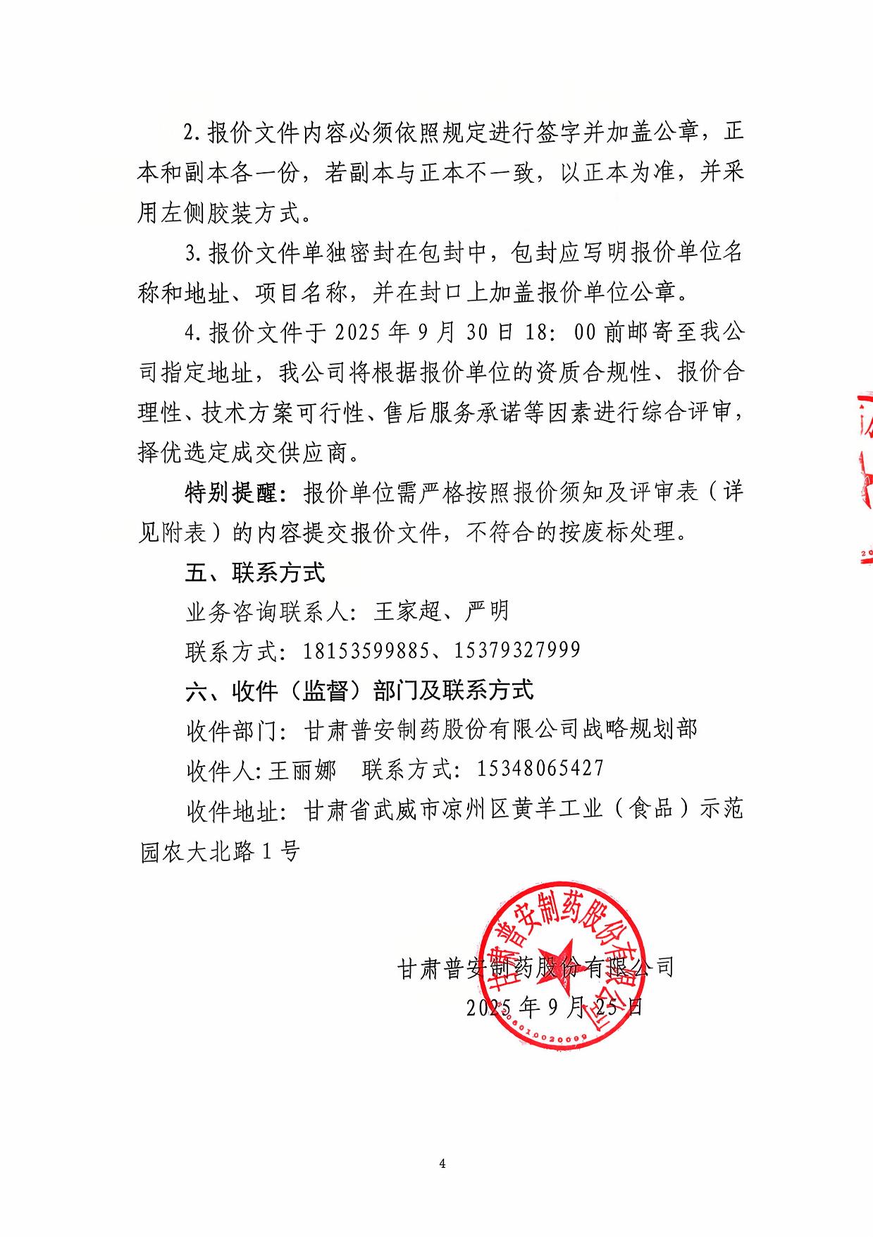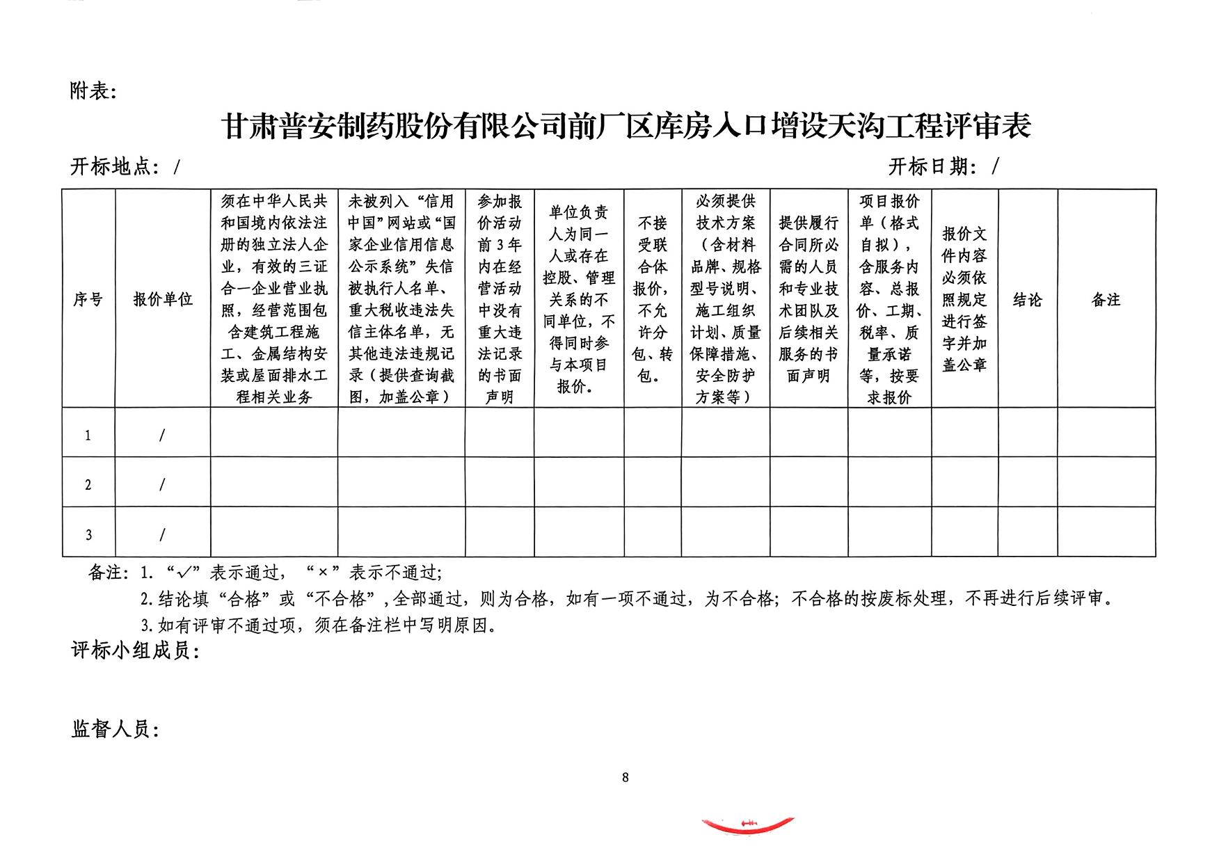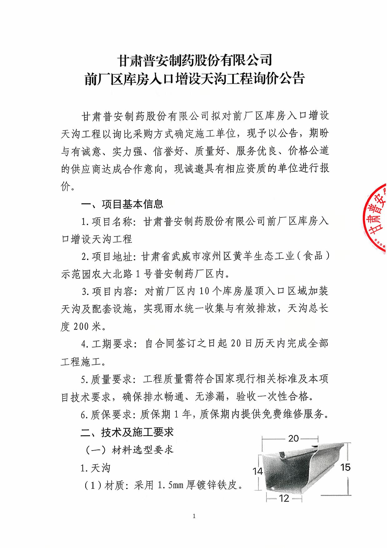 甘肅普安制藥股份有限公司前廠區庫房入口增設天溝工程詢價公告